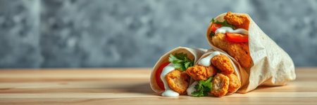 Delicious chicken wraps filled with fresh ingredients and creamy sauce on a wooden table