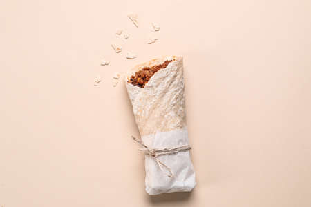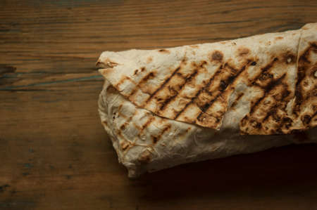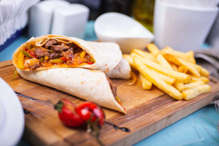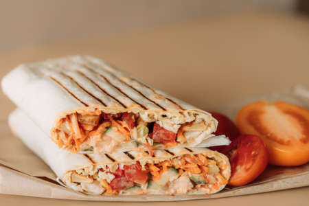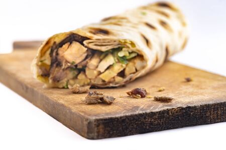 Traditional Caucasian meat in a tortilla with spices and seasonings is wrapped in a tube.