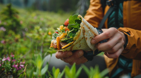 A hiker unwrapping a homemade wrap filled with fresh veggies and local meats the mountain air making their mouth water