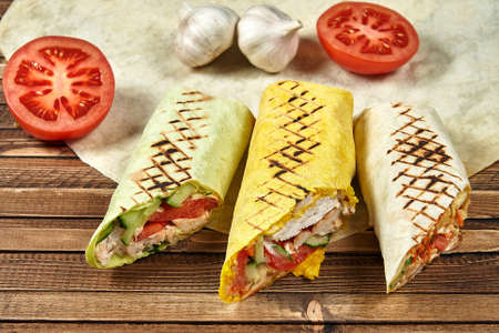 three types of shawarma from cheese lavash and garlic lavash. fresh tomatoes and garlic on a wooden table. High quality photo