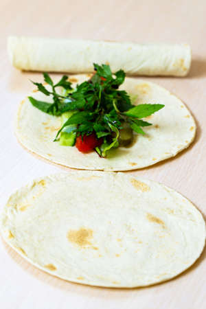 Cooking rolls with meat and vegetables. Roll in flatbread. Food preparation.