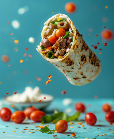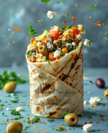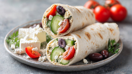 A visually appealing Mediterranean wrap filled with fresh vegetables and feta cheese served on a rustic plate, ideal for health-conscious meals or food photography.