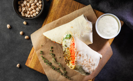 Vegetarian shawarma with fresh vegetables, sauce and chickpeas on a cutting board on a dark background. The concept of vegan fast food. Top view.