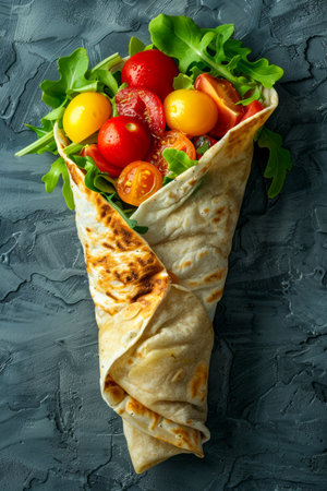 Fresh Vegetable Wrap with Tomatoes, Lettuce, and Mixed Greens on Textured Dark Background AI Generative