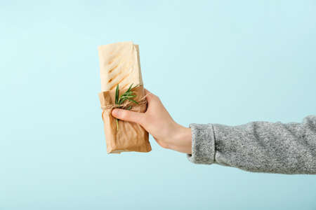 Hand takes doner roll shawarma with chicken and vegetables on yellow