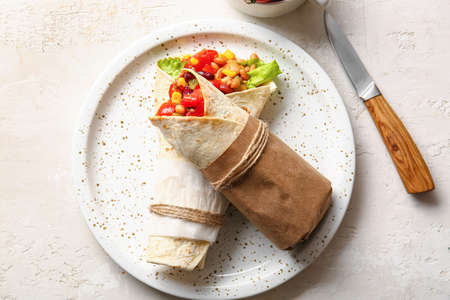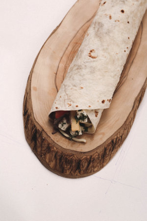Delicious beef fajita wrap with fresh vegetables on a wooden board