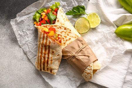 Traditional Mexican food burritos with beans and vegetables. Vegetarian rolls with red beans and vegetables lie on an aged wooden table.