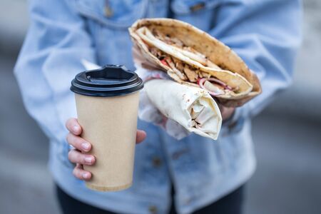 A young woman holding a glass of coffee and fast food. Close up. The concept of fast food .
