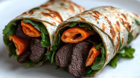 Tasty wraps with grilled beef, fresh greens, and zesty peppers are perfect for lunch!