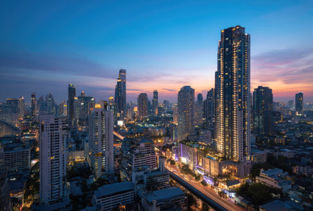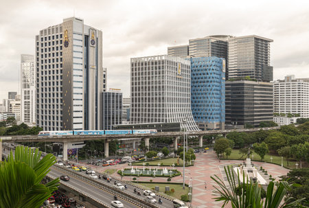 Bangkok, Thailand - 22 Sep, 2025 - a prominent high-rise building, the BTS Skytrain on an elevated track, and roads with vehicular traffic below, all characteristic of a bustling city center like Bangkok. a modern urban scene. Selective focus.