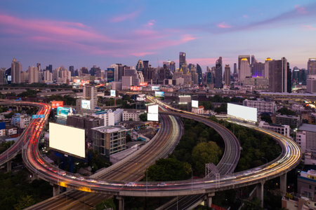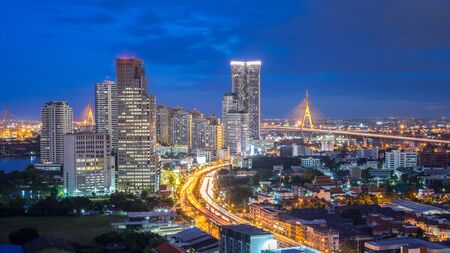 Business Building Bangkok city area at night life with transportation way logistic concept high angle bird eyes view
