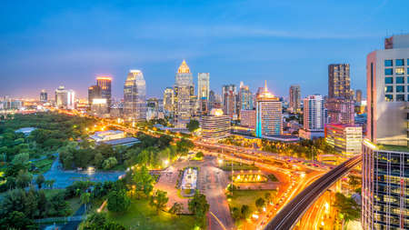 Business Building Bangkok city area at twilight scene with transportation car and ship as panorama, high angle bird eyes view