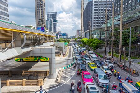 Bangkok, Thailand - December 3, 2020: Traffic jam in city center in Bangkok, Thailand. Annually an estimated 150,000 new cars join the heavily congested streets of the Thai capital.