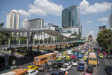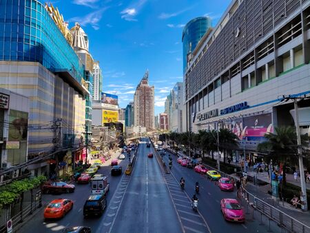 Bangkok, Thailand - January 10, 2016: Aerial view of Ratchadamri Road with traffic jams, where the Central World Shopping Plaza is located. It is the sixth largest shopping complex in the world