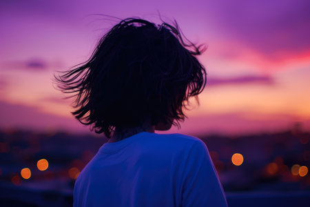 An elegant silhouette of a woman with flowing hair her profile accentuated by a soft purple neon outline evoking a sense of mystery and beauty in the twilight..