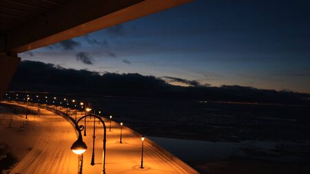 Beautiful view of the modern road with lights near the Bay at night. Concept. Quiet, peaceful view of the Bay lights at night in winter