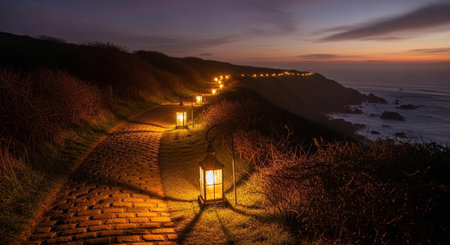 final light of the sun is falling on the mountain in the evening, and the lamp in vintage tone.
