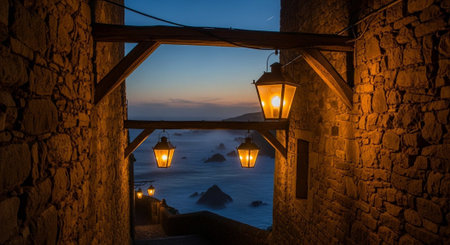 Beautiful panoramic view of the Mediterranean bay at night against the background of an old lantern in the village of Borgio Verezzi, located in the Ligurian mountains above the Mediterranean Sea in Italy