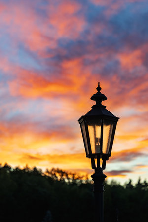 Vintage street lantern glowing at sunset with colorful dramatic clouds and silhouette of forest trees in the background