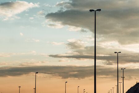 row of pillars lighting saving energy evening against the sky and clouds