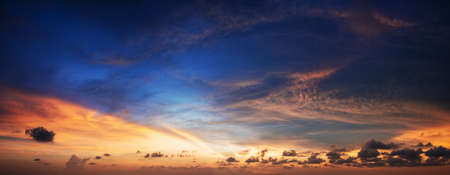 Colorful dramatic sky with cloud at sunset. Panoramic view.