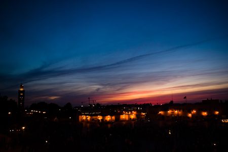Sunset at Djema el fna. On the left corner is the most important mosquee of the city the Koutubia Mosquee