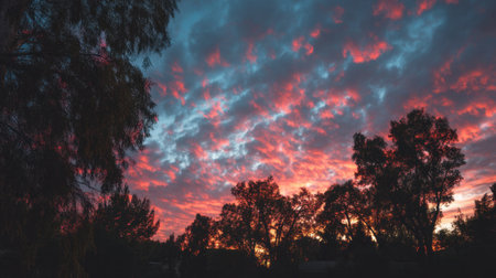 Experience the beauty of a stunning sunset featuring vibrant clouds and silhouetted trees, capturing the serenity of nature at dusk.
