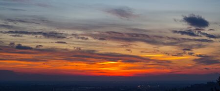 Fiery sunset from the old city of Bergamo to the Po valley. Lombardy, Italy