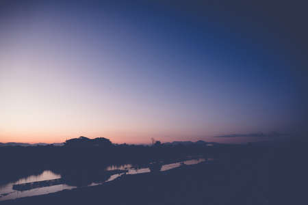 Sunset landscape with tree branches in silhouettes. Feeling of peace and tranquility