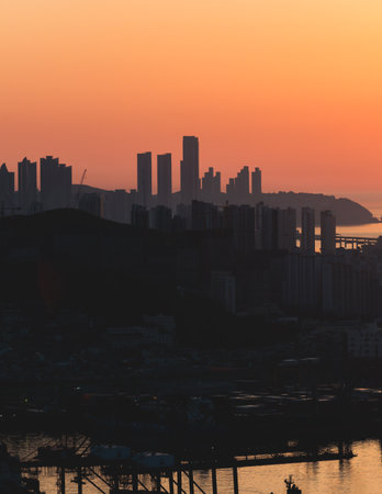 Busan sunset city panorama, beautiful skyline view with high-rise buildings skyscrapers at dawn, Busan port daybreak, cityscape with harbor bay, South Korea, Yeongnam district, sunny day