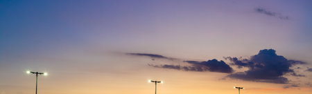 A wide, minimalist background featuring a serene sunset sky with soft gradients of blue, purple, and warm orange tones. Three illuminated street lights appear subtly at the bottom of the frame, creating a clean and modern composition perfect for use as a backdrop, header, banner, or design overlay. Ideal for projects requiring calm atmospheres, open space, and elegant negative space.