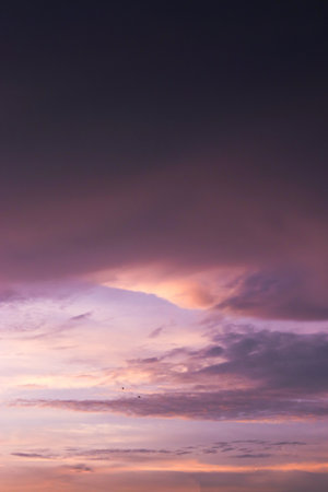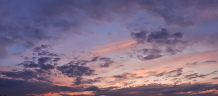 A breathtaking view of a sunset sky filled with soft clouds and vibrant colors, capturing the tranquil beauty of nature during twilight hours.