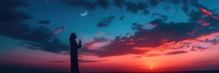 A man stands in silhouette with hands raised in prayer, surrounded by a breathtaking sky. The vivid colors of purple and orange blend beautifully as a crescent moon shines above.