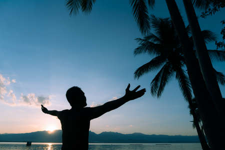 Silhouette of a man with raised up hands enjoying amazing view of a sunset over sea, enjoying summer vacation on the beach