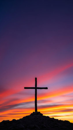 Silhouette of a cross at dawn with glowing orange and blue sky, symbolizing peace and faith. Concept of religion and hope for new beginnings.