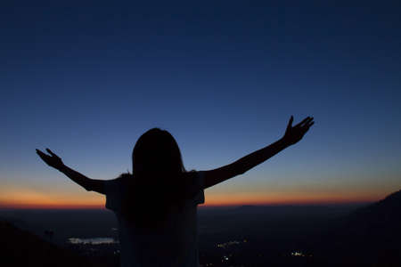 Silhouette woman on sunset background. Woman raising his hands in worship. Christian Religion concept background.
