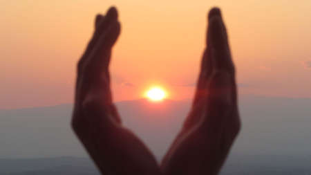 Woman hands place together like praying in front of nature blur beach sunset sky background.