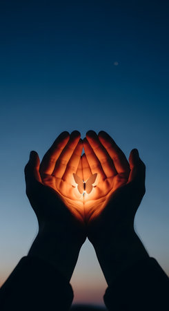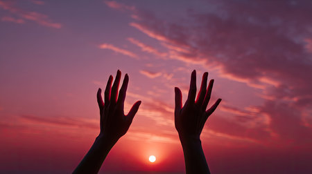 Hands in a prayer position against a glowing sunset, capturing a moment of gratitude, spiritual connection, and inner peace