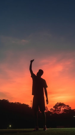 Generative AI : Silhouette of man in the evening watching beautiful sunset with arms raised up outstretched cheering and happy