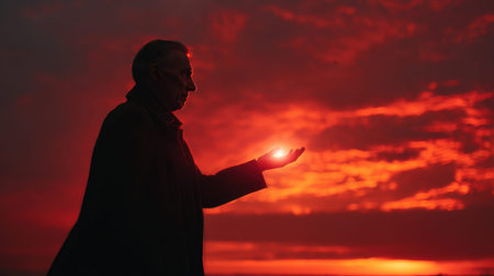 Silhouette of caucasian male holding light against dramatic red sunset sky.