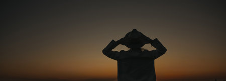 Silhouette of unrecognizable happy man in hood at sunset
