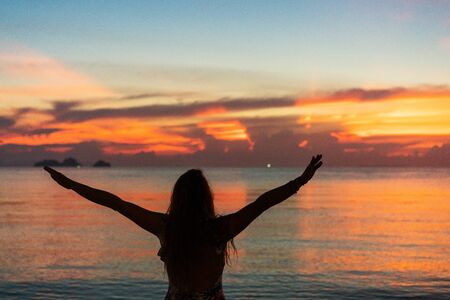 Woman raise hand up like bird shape at tropical sunset beach abstract background. Freedom feel good and travel adventure concept. Vintage tone filter effect color style.