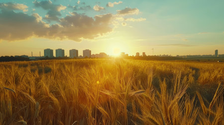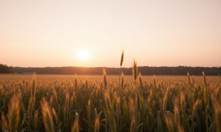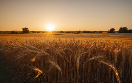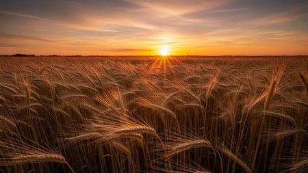 A breathtaking view of a golden wheat field at sunset, with the sun casting warm light over the crops. A serene rural landscape invites tranquility and connection to nature.