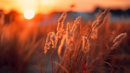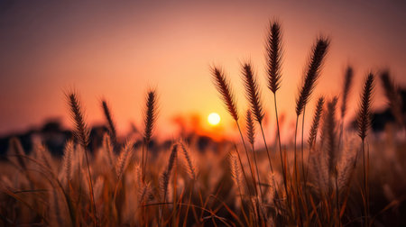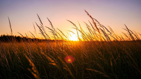 Sunset over field of tall grass creates serene atmosphere, with golden hues illuminating landscape. soft focus on grass adds dreamy quality to scene