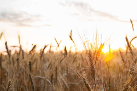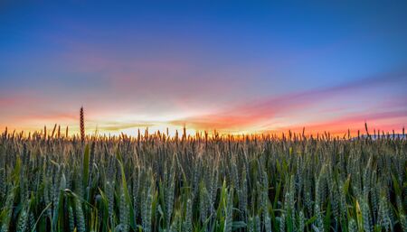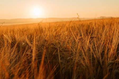 Sunset or sunrise in a wheat field with ears of young golden rye in the foreground.