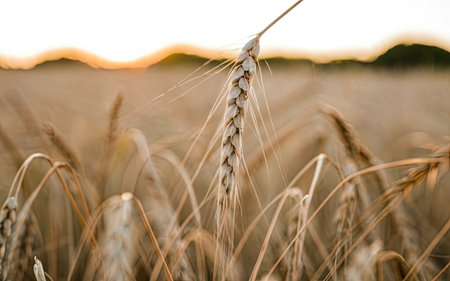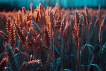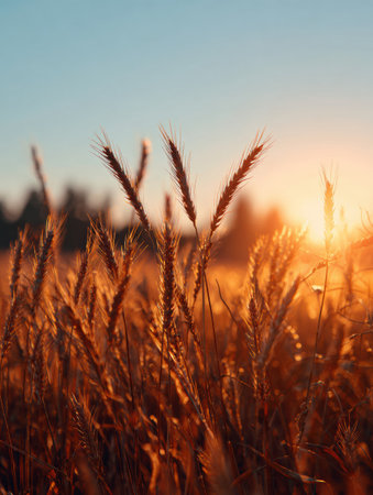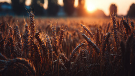 Close-up of wheat stalks bathed in warm sunlight during the golden hour. The image displays a field of ripe wheat with a shallow depth of field, creating a blurred background. The setting suggests an outdoor environment with rich colors, suitable for agricultural or environmental themes. Ideal for various commercial uses.