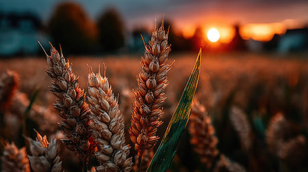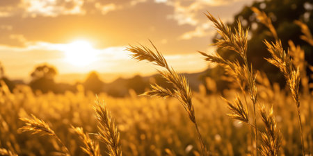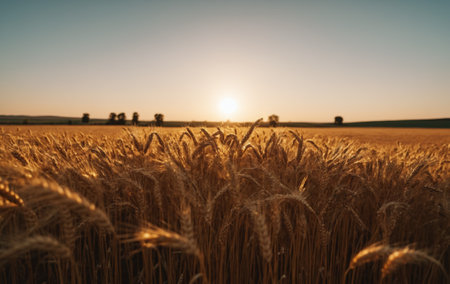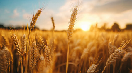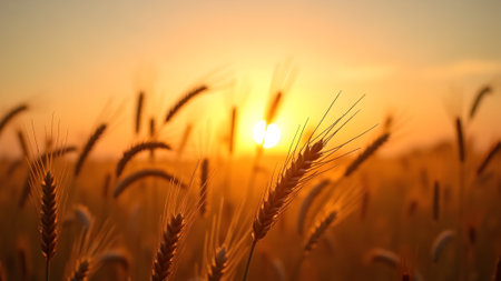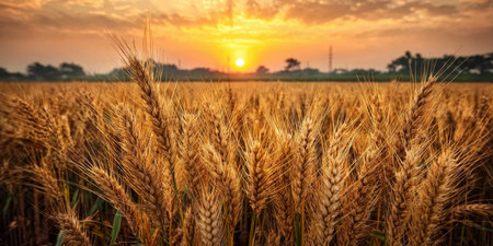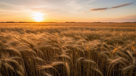 A breathtaking view of a golden wheat field at sunset, capturing the essence of nature's beauty with warm colors and serene ambiance. Ideal for agricultural themes.