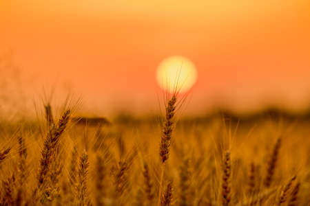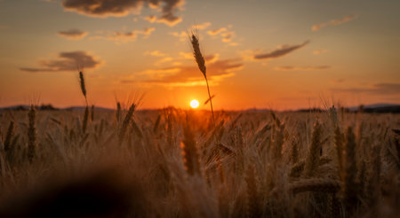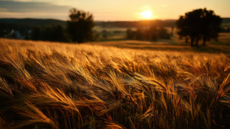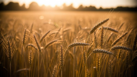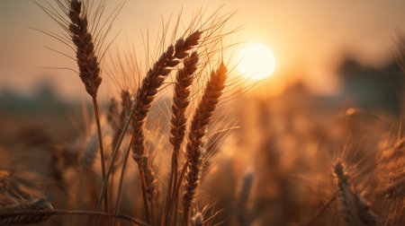 A view of a golden wheat field bathed in the warm glow of a sunset. The sun is low on the horizon, casting long shadows and illuminating the ripe wheat stalks with an amber light. The soft focus and bokeh effect create a serene and peaceful atmosphere, highlighting the beauty of the natural landscape. evokes feelings of abundance, tranquility, and the essence of rural life during harvest season.