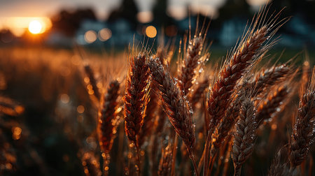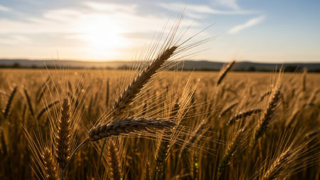 A view of a golden wheat field bathed in the warm, soft light of a sunset. The foreground is in sharp focus, showcasing individual stalks of wheat with their ripe grains, while the background dissolves into a bokeh of warm colors. The setting sun casts long shadows and creates a serene, peaceful atmosphere. captures the essence of harvest, agriculture, and the natural beauty of a rural landscape during the golden hour.
