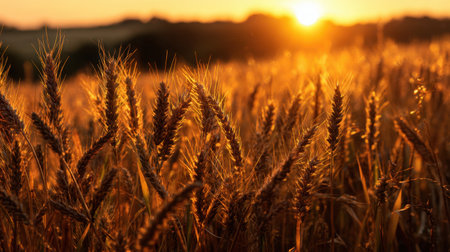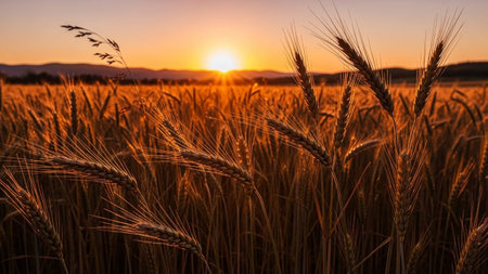 A view of a vast wheat field bathed in the warm, golden light of a setting sun. The stalks of wheat are illuminated from behind, creating a radiant glow and highlighting their delicate textures. The sun, a bright orb on the horizon, casts long shadows and paints the sky in hues of orange and yellow. Distant hills form a soft silhouette against the vibrant sky, adding depth to the serene and picturesque rural landscape. evokes feelings of peace, abundance, and the beauty of nature's harvest.